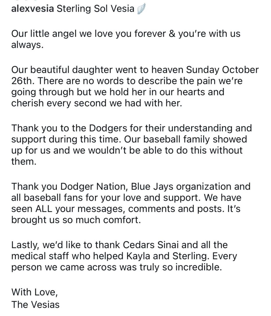「私たちが経験しているこの痛みを表現する言葉はありませんが、娘を心に抱き、一緒に過ごしたすべての一瞬一瞬を大切にしました。このような時に理解とサポートを示してくれたドジャースに感謝します。私たちの野球ファミリーが駆けつけてくれました。彼らなしでは、これを乗り越えることはできなかったでしょう」