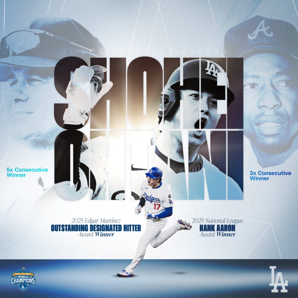 大谷翔平選手は、全米野球記者協会(BBWAA)によるナ・リーグMVPを3年連続・4度目に受賞しました。