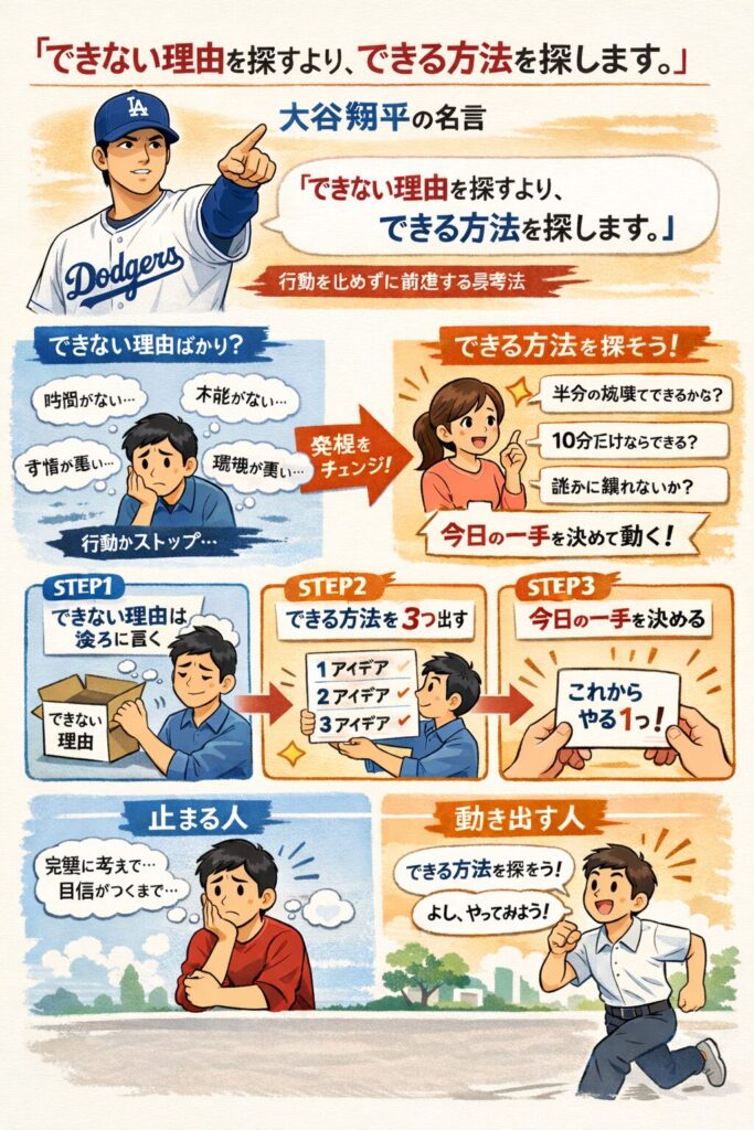 「できない理由を探すより、できる方法を探します。」という大谷翔平 名言として広く引用される言葉は、根性論ではなく“思考の順番”を整える合図です。
