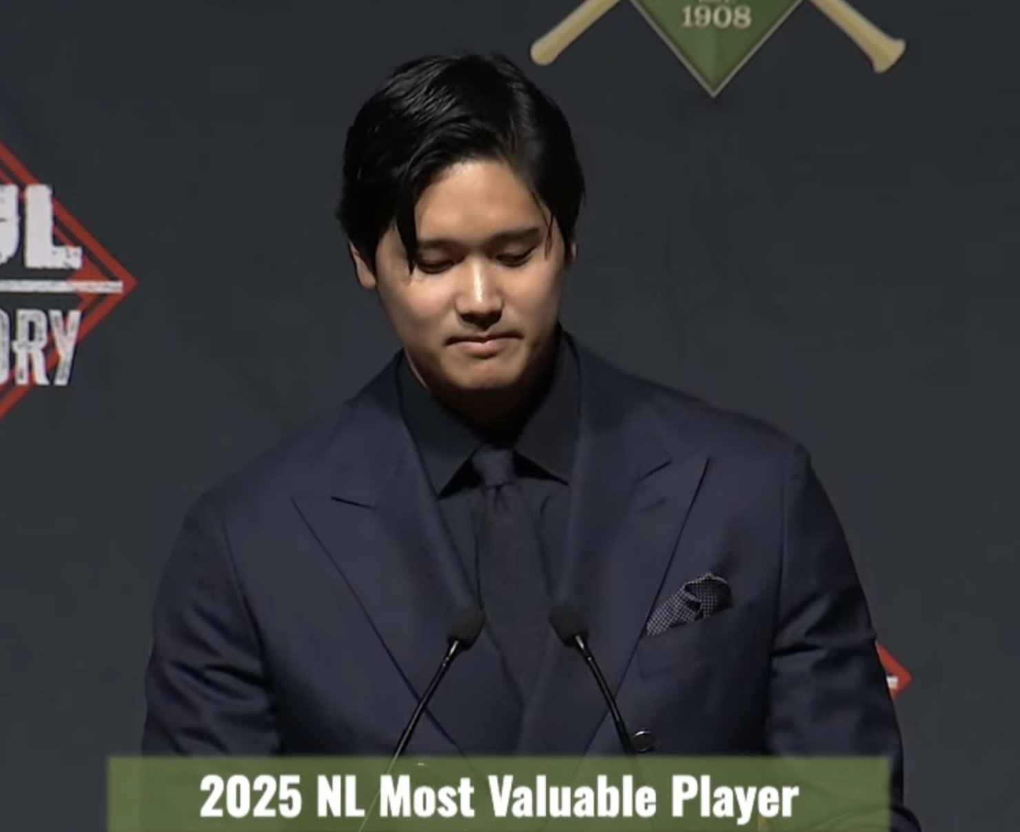 黒のシャツとネクタイに紺のジャケット姿で壇上に立った大谷翔平は、胸元からメモを取り出し、全編英語で感謝の言葉を丁寧に述べました。