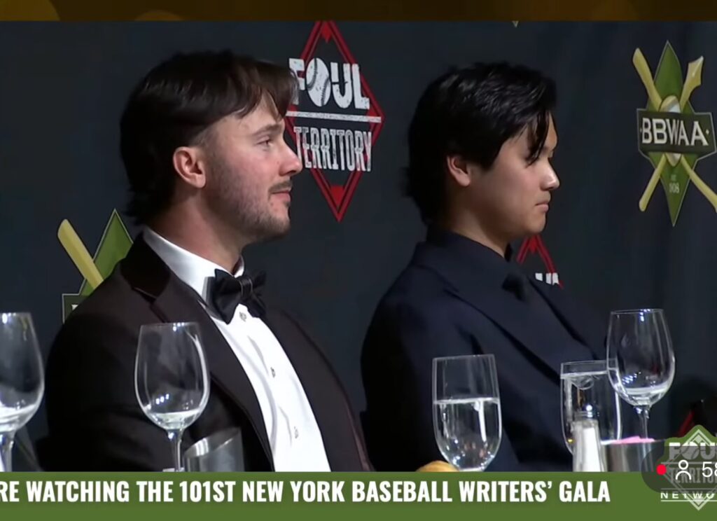 ネイビーのスーツに身を包んだ大谷選手は、サイ・ヤング賞を初受賞した若き怪物右腕ポール・スキーンズ投手と隣同士で着席し、通訳を介さず自然に談笑する姿が注目を集めています。