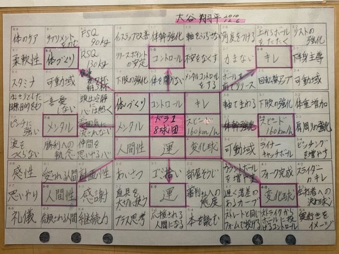 花巻東では、目標設定シートを使って大きな夢を具体的な行動に落とし込む取り組みが行われてきました。これは大谷翔平選手の高校時代を語るうえでも有名な要素です。