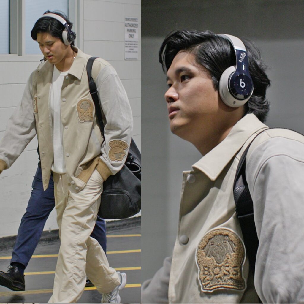 この日、大谷選手はベージュカラーのジャケットにヘッドホンを装着して登場