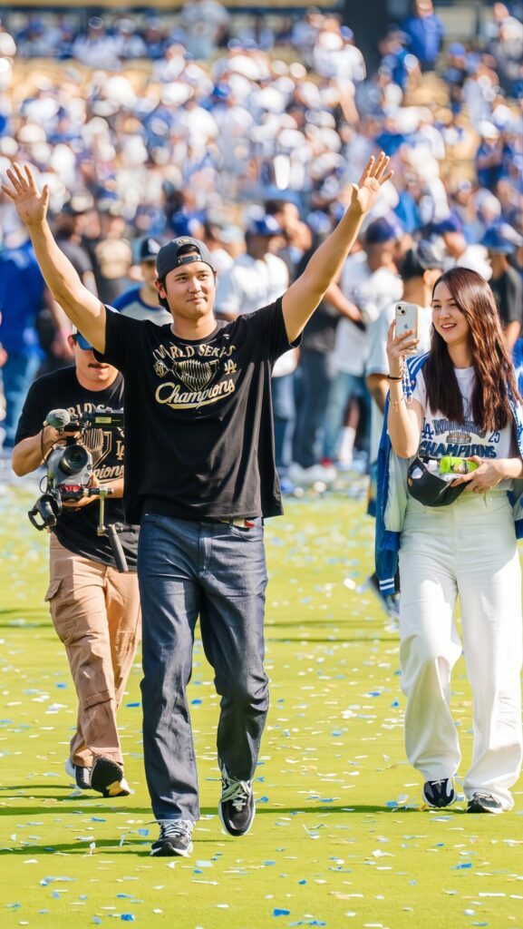 3日(日本時間4日)にロサンゼルスで行われたパレードで、大谷夫妻は2階建てバスの上からファンに笑顔で応え、その後のスタジアムでのセレモニーにも参加しました。