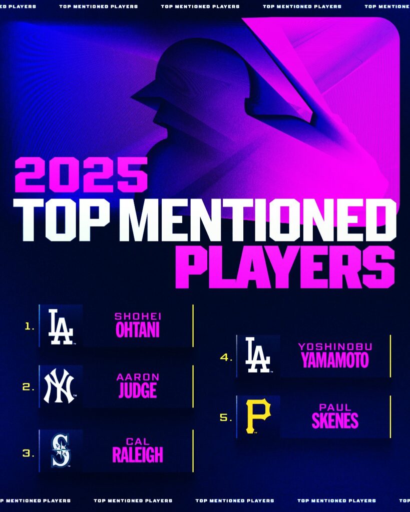 2025年に最も言及されたMLB選手ランキングは、大谷選手だけが突出しているわけではなく、他のスターたちも名を連ねています。