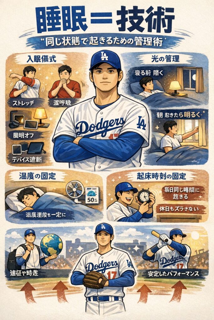 大谷翔平選手のように年間を通して高水準を維持するタイプにとって重要なのは、「よく寝たか」よりも「同じ状態で起きられるか」です。