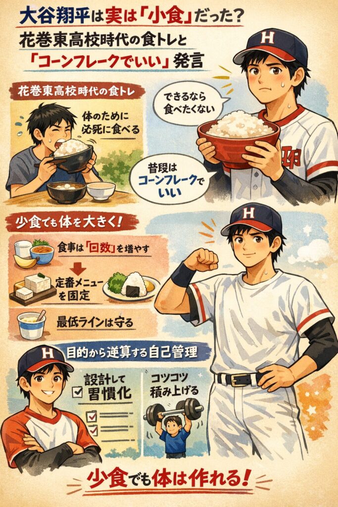 大谷翔平選手は、もともと少食寄りでありながら、花巻東高校時代に体づくりの必要性から食事と向き合い、競技仕様の体を作ってきた文脈で語られています。