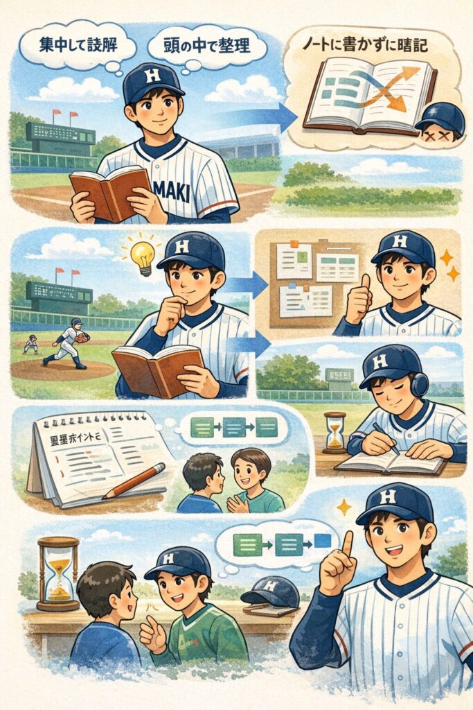 ノート暗記型ではなく、頭の中で組み立てる学び方は、集中力・取捨選択・再現性を育てやすく、競技の判断力とも相性が良いスタイルです。
