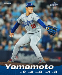 山本由伸投手はポストシーズンの大舞台で2試合連続完投勝利という24年ぶりの快挙を達成し、ドジャースをシリーズ1勝1敗のタイに戻しました。