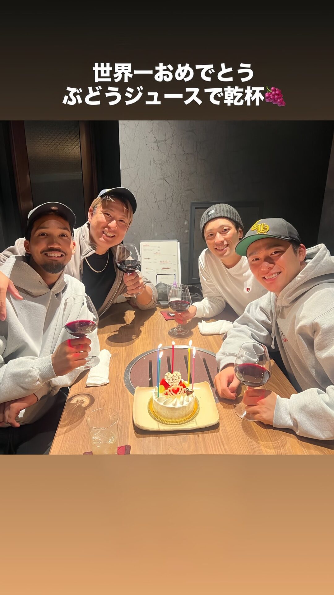 オリックス杉本裕太郎がドジャース・山本由伸と感動の再会!「ぶどうジュースで乾杯」「よしのぶ世界一」祝福ケーキも登場で元チームメート4人の笑顔が弾ける一幕